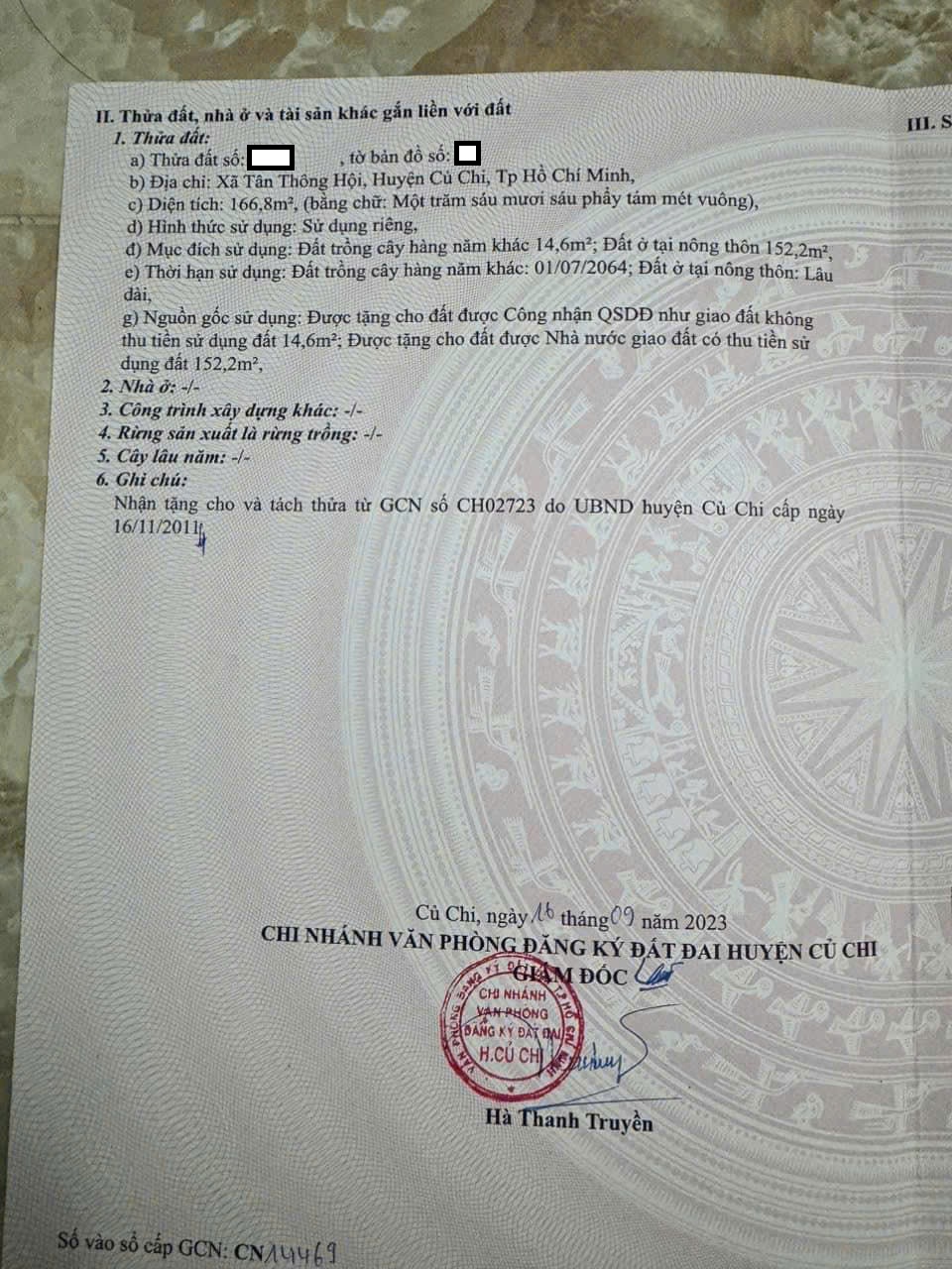 Bán đất Tân Thông Hội – Củ Chi Diện tích chuyển nhượng 166m² (5 × 33) Thổ cư 152m², xây dựng thoải mái